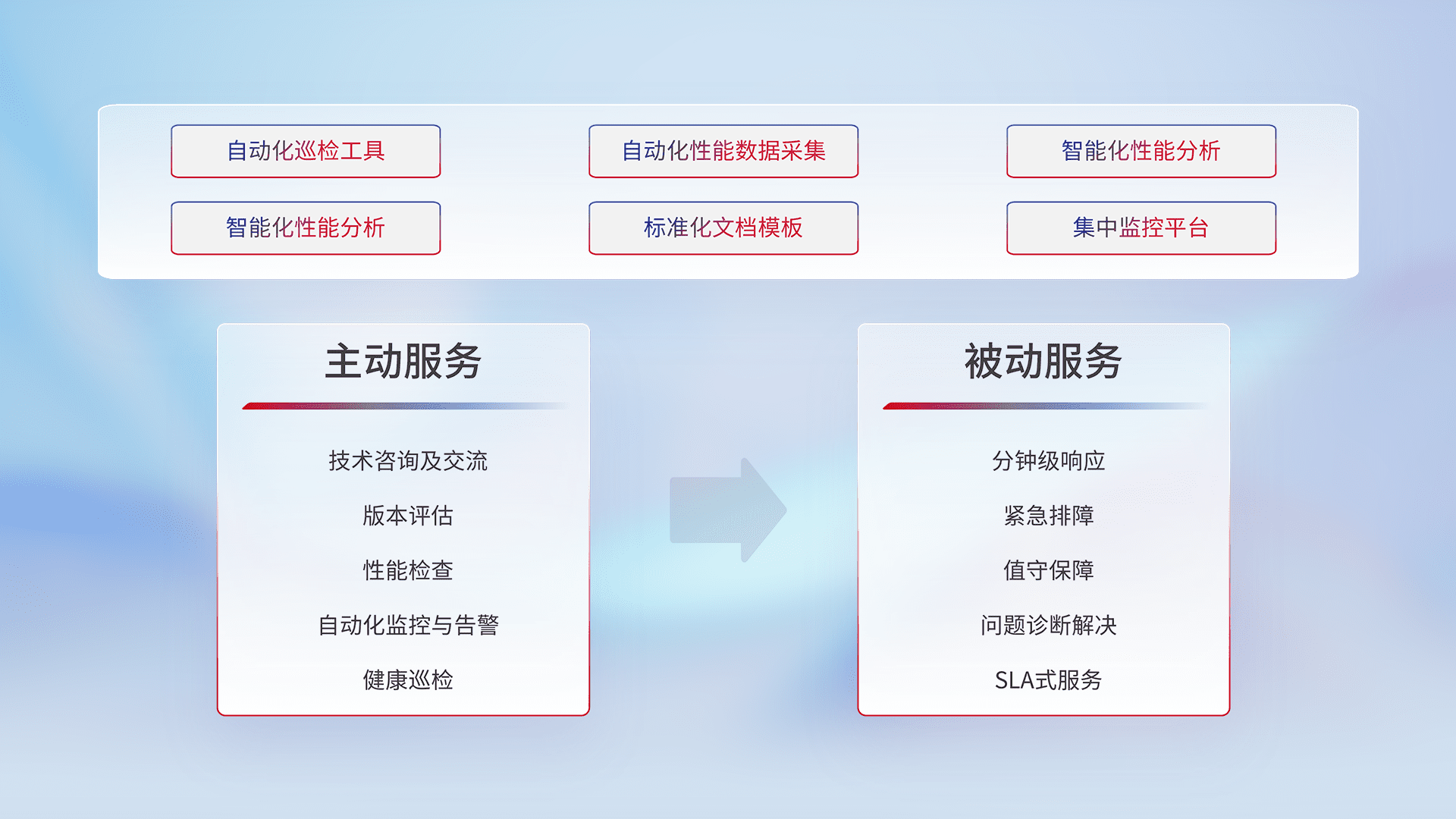 智能化工具和标准化文档,,,,保障服务质量,,提供主动服务(包含技术咨询、、版本评估、、、、性能检查、、、、自动化监控与告警、、、、健康巡检)和被动服务包含(分钟级响应、、紧急排障、、值守保障、、问题诊断解决、、SLA服务)。。。